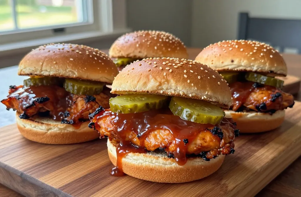 – Build the slider: soft buns, a little mayo or pickles for zing, and the star—the chicken coated in glossy BBQ sauce.