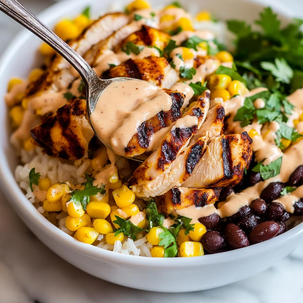 Smoky chipotle chicken with creamy street corn topping over cilantro lime rice. High-protein bowl ready in 45 minutes.